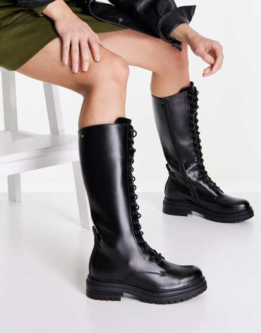 XTI Bottes hauteur genou lacets avec semelle paisse Noir