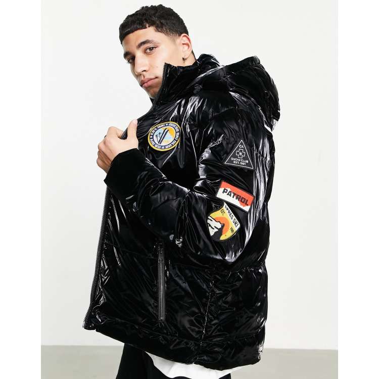 Guess shiny puffer jacket in black with badge logo ASOS