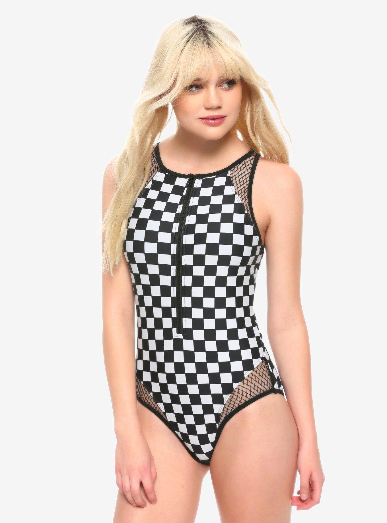 Black White Checkered Zip Up Swimsuit Hot Topic