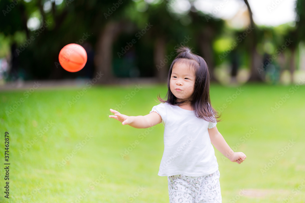 Kid throwing ball new arrivals, Excited little cute girl playing orange ball on soccer field new arrivals