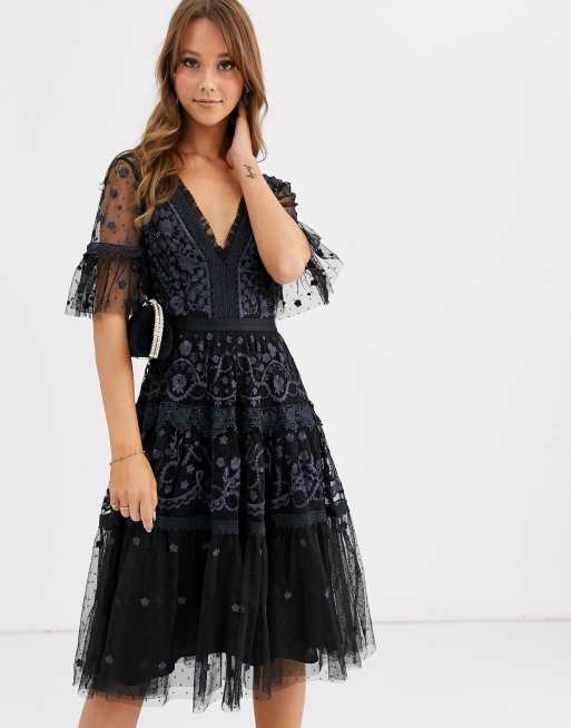 Needle Thread embroidered lace midi dress in black and charcoal blue