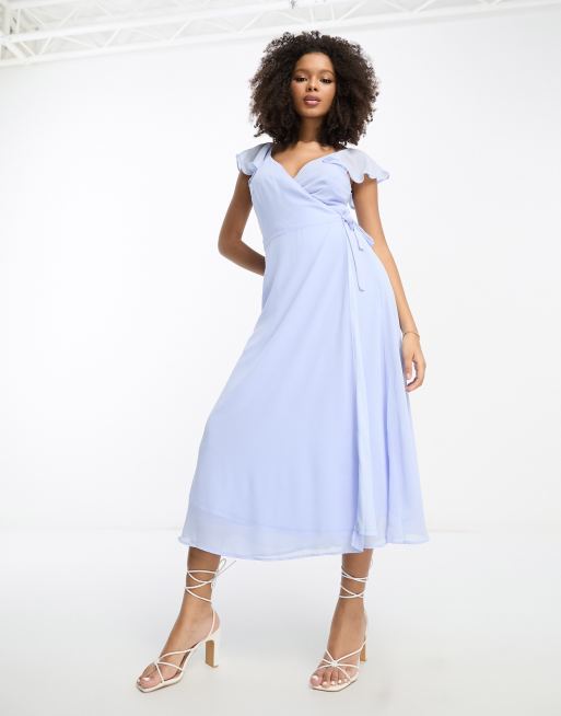 Vila Bridesmaid wrap full skirt maxi dress with flutter sleeves in blue