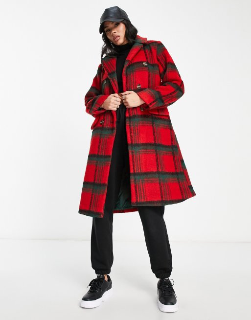 Red check coat womens new arrivals, QED London double breasted longline coat in red plaid new arrivals