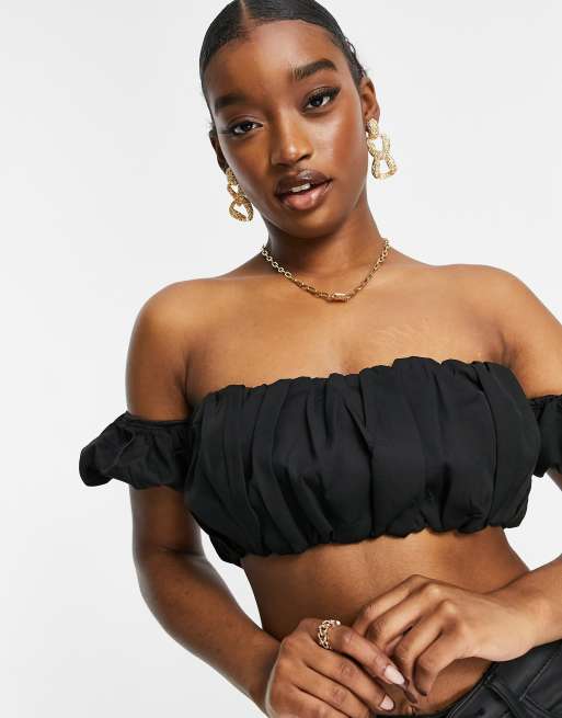 Black Dobby Mesh Off Shoulder Ruched Crop Top