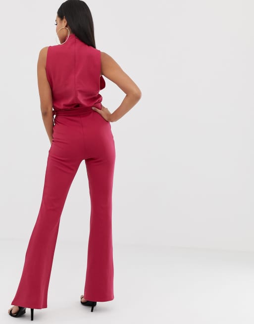 PrettyLittleThing scuba high neck tie waist jumpsuit in raspberry