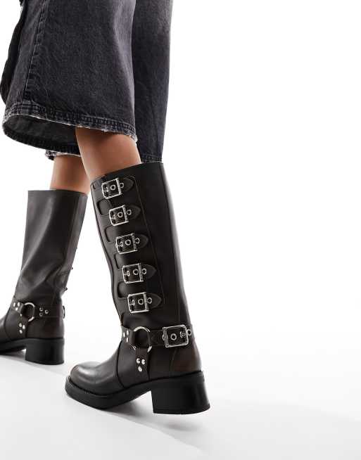 Steve Madden Battle leather biker boots in brown with multi