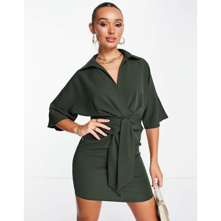 Wrap batwing dress new arrivals, ASOS DESIGN collared wrap front batwing mini dress with knot in new arrivals