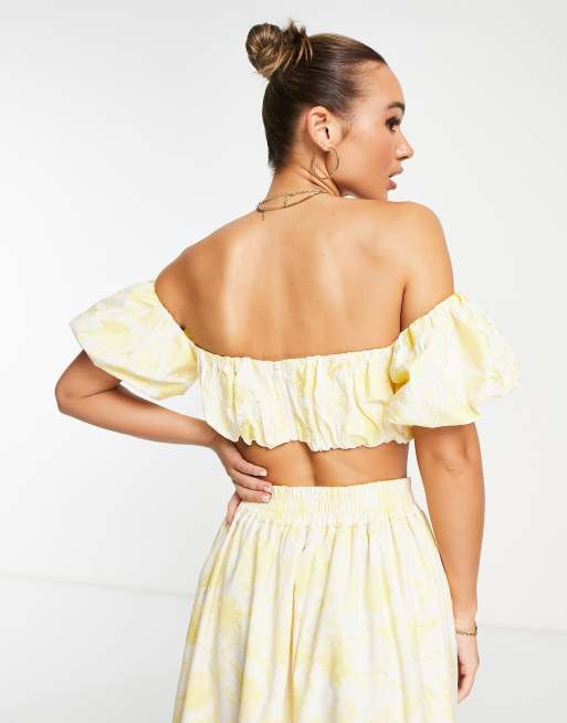 ASOS EDITION off shoulder puff crop top in yellow floral jacquard