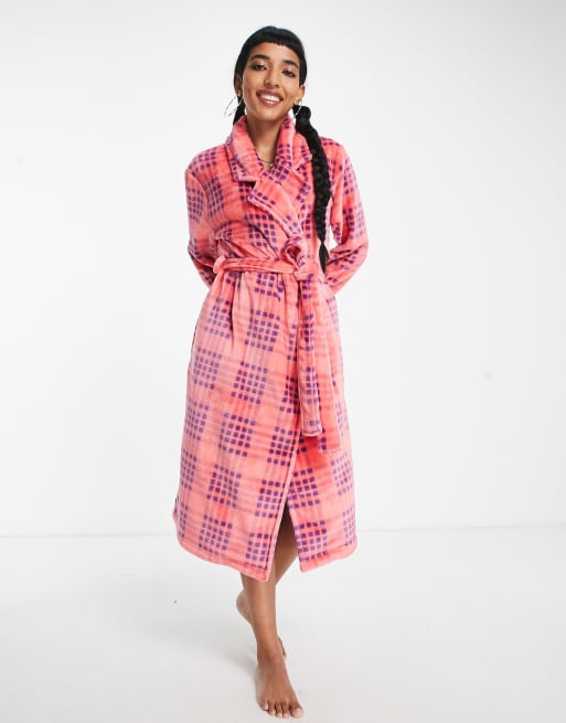 ASOS DESIGN super soft check fleece midi robe in pink ASOS