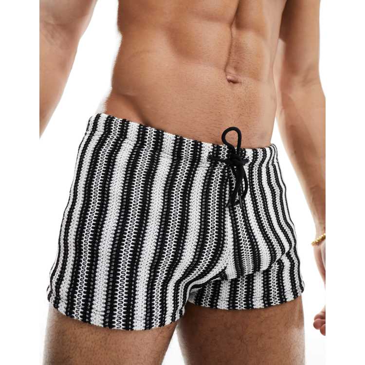 Black and white striped swim trunks new arrivals, ASOS DESIGN swim trunk with crochet stripe in black and white new arrivals