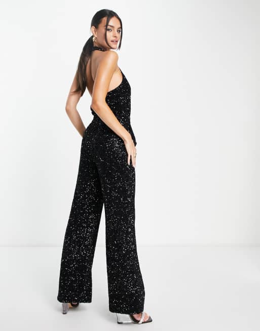 Pieces Tall glitter halterneck jumpsuit in black ASOS
